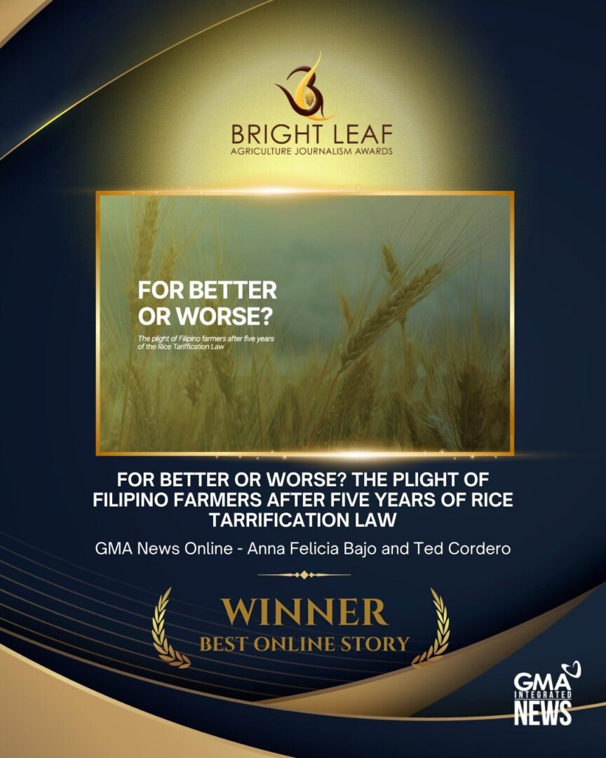 Pinarangalan ang GMA Integrated News sa 18th Bright Leaf Agriculture Journalism Awards!Nagwagi ang istoryang “For Better Or Worse? The Plight of Filipino Farmers After Five Years of Rice Tariffication Law” nina Anna Felicia Bajo at Ted Cordero ng GMA News Online bilang Best Online Story.